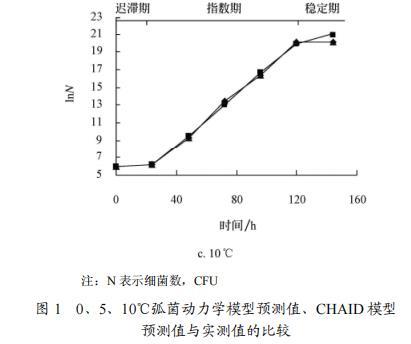 由图1可以看出,在指数生长期动力学模型比CHAID模型能够更好的预测弧菌的生长,但在迟滞期和稳定期CHAID方法的预测值明显优于弧菌生长动力学模型。因此可以对弧菌动力学模型进行改进,提高其预测的准确性。