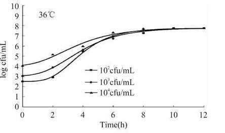 36℃下,Gompertz模型拟合的不同浓度LM在营养肉汤中的生长曲线见图3。三个不同初始菌浓度的生长曲线均在约1~2h后进入对数期,LM的生长延滞期随初始菌浓度的增加而缩短。进入对数期后,初始菌浓度越低,LM的生长速率越快。约在8h后进入稳定期,细胞密度达到最大值,约107cfu/mL。