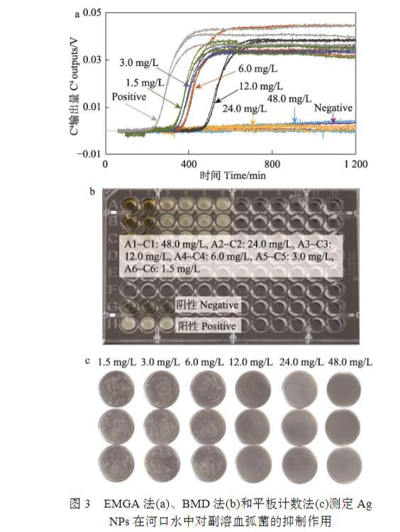 图3 EMGA法(a)、BMD法(b)和平板计数法(c)测定AgNPs在河口水中对副溶血弧菌的抑制作用