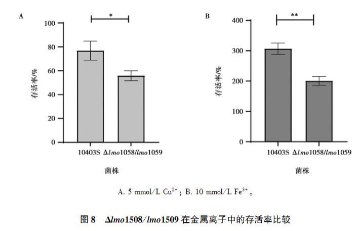 通过氧化应激试验结果得知,在5 mmol/L Cu2+应激处理后,lmo1508/lmo1509缺失使得LM的存活能力显著降低,10 mmol/L Fe3+的应激处理后,lmo1508/lmo1509缺失使得LM的存活能力极显著降低(图8),说明lmo1508/lmo1509对LM的抗氧化应激能力存在正调控影响。