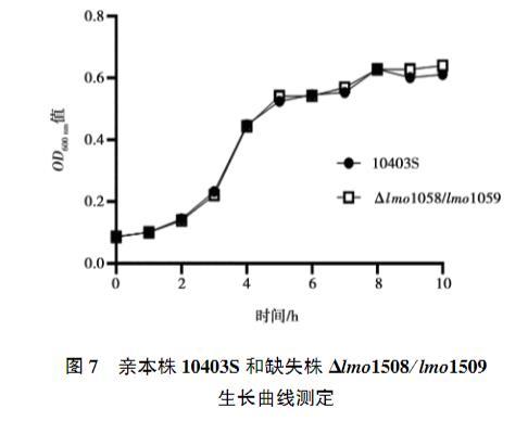生长能力测定结果显示,缺失株Δlmo1508/lmo1509与亲本株10403S在BHI培养基中的生长趋势相似(图7),表明lmo1508/lmo1509基因不影响菌株10403S的生长能力。