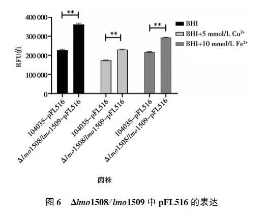 选择转录水平上升幅度最高且具有显著差异性的Δlmo1508/lmo1509进一步研究,TCS缺失株Δlmo1508/lmo1509的荧光值在BHI、5 mmol/L Cu2+和10 mmol/L Fe3+环境下极显著高于参考菌株10403S(图6),说明lmo1508/lmo1509对gsh-px具有负调控作用。