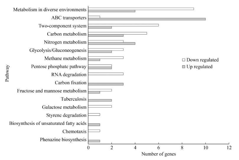 首先对900μmol/(m2·s)高光条件下2株藻的转录组数据进行了初步整理。如图5所示,相较于野生型6803,高光6803共有77个差异表达基因,其中41个表达下调,另外36个表达上调。结合KEGG数据库给出的相关信息,上述77个差异表达基因可被归类于17个功能途径,其中大部分与能量-物质代谢、环境因子响应有关。与物质代谢途径相关的基因有50个,占总数的64.9%;与环境因子响应相关的基因有21个,占总数的27.3%,其中8个与双组分调控系统(two-component system,TCS)有关,13个与依赖ATP的ABC转运子相关;另有6个基因与细胞膜的形成、DNA修复及RNA降解等相关,占比为7.8%。对碳、氮代谢相关基因的表达情况分析后,发现高光6803基因组上与碳、氮同化相关的基因的表达水平均上调,与有机物降解利用相关的基因的表达水平则均下调。已知离子跨膜转运及碳、氮元素同化代谢都消耗大量能量,因此这一转录组学分析结果可以初步解释高光条件下高光6803未发生光抑制且能够快速生长的原因,即通过跨膜离子转运及碳、氮元素同化代谢消耗胞内多余能量,减轻光抑制、光损伤对细胞造成的伤害。另一方面,相较于野生型6803,高光6803借助加强的能量-物质代谢,将来自高光的能量更有效地进行利用,提供充足的能量供给用于胞内的物质同化代谢;同化能力越强,则积累的生物量越多,生长亦越快。综上所述,相较于野生型6803,高光6803在高光培养条件下未表现出明显的光抑制或者光胁迫,通过增强的光合作用过程,吸收的光能被快速转化为化学能,为元素同化作用提供充足能量,增强的能量-物质代谢循环也为避免光损伤、加快细胞生长提供助力。