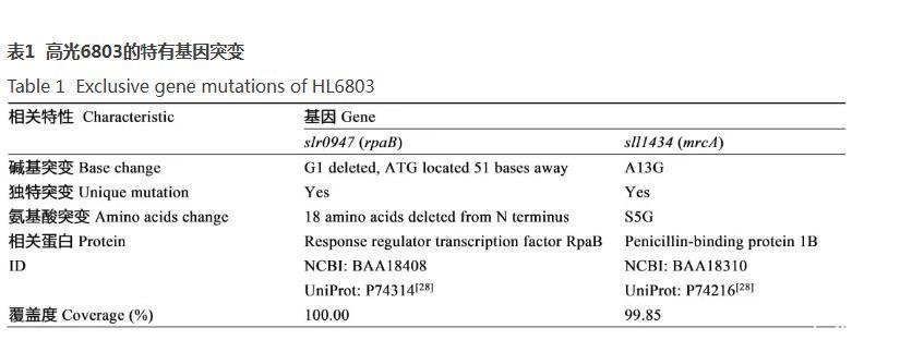 已知在NCBI基因组数据库中除了我们选定的参考基因组序列(GCF_000009725.1,BA000022.2)外,还有其他10组集胞藻基因组序列数据。为明确上述20个有义突变是否为高光6803所特有,我们将这些突变与其他10组集胞藻6803突变株基因组序列、已发表的期刊数据进行交叉比对,最终筛选到2个仅存于高光6803基因组的突变(表1),其余18个有义突变或已存在于NCBI数据库,或已在期刊文献中已报道。