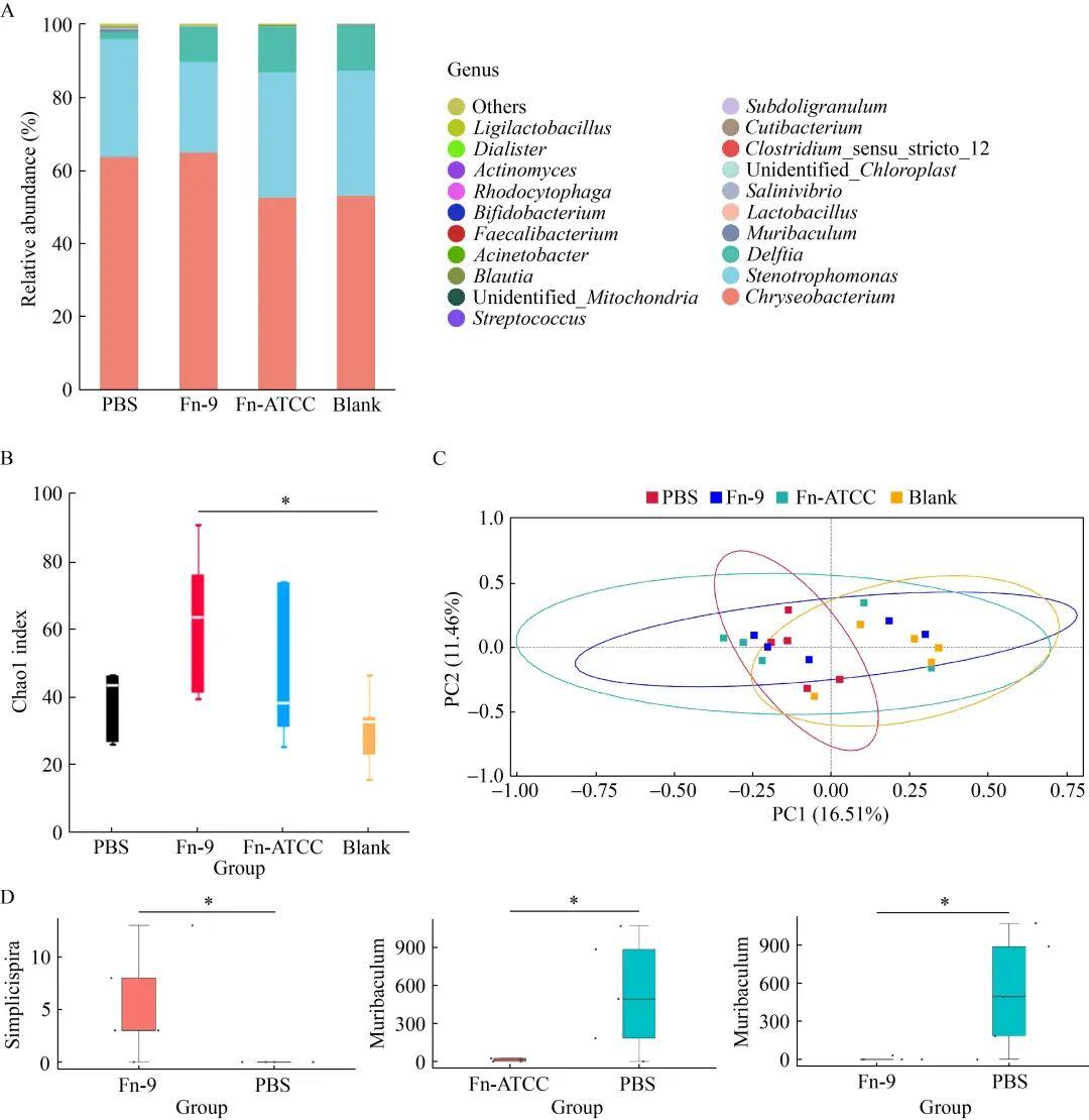 图4具核梭杆菌对肺部微生物群的影响。A:4组菌属水平前20个丰度的群落条形图;B:4组肺泡灌洗液的Chao1指数(P值通过Kruskal-Wallis检验计算,*:P<0.05);C:4组肺泡灌洗液的PCoA图(ANOSIM用于统计评估显著差异);D:MetagenomeSeq检测4组之间的差异物种(*:P<0.05)。