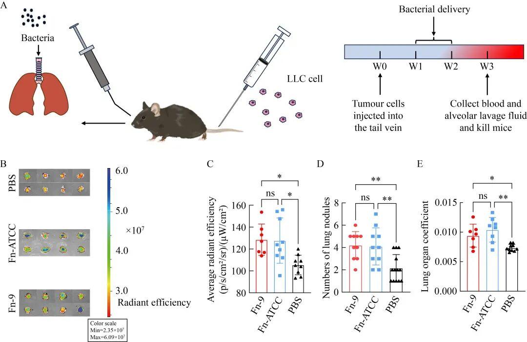 图2具核梭杆菌促进小鼠肺癌转移。A:实验流程图;B、C:Fn-9、Fn-ATCC和PBS 3组荧光强度比较;D、E:3组肺结节数量和肺器官系数。