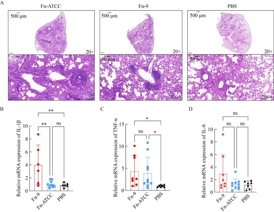 图3病理切片图和定量聚合酶链反应(qPCR)。A:Fn-9、Fn-ATCC和PBS 3组肺组织切片;B-D:IL-1β、TNF-α和IL-6在小鼠肺组织中的表达(ns:无统计学意义;*: