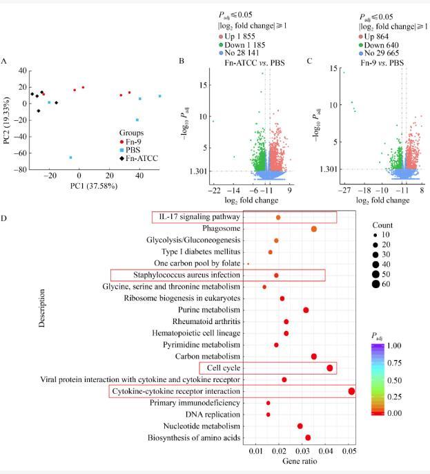 转录组测序用于描述肺组织变化的特征。主成分分析(principal components analysis,PCA)结果显示,Fn-9组、Fn-ATCC组和PBS组的转录组基因存在显著差异(图5A)。进一步通过火山图比较其差异基因的变化,发现与PBS组相比,Fn-ATCC组共有1 855个差异基因表达上调,1 185个差异基因表达下调(图5B);而在Fn-9组与PBS组的比较中,Fn-9组共有864个差异基因表达上调,640个差异基因表达下调(图5C)。随后,分析了3组小鼠肺组织中KEGG通路差异基因的富集情况。在Fn-9组、Fn-ATCC组和PBS组的比较中,差异基因主要富集在IL-17信号通路、细胞因子-细胞因子受体相互作用、细胞周期和运动蛋白等信号通路上,这提示Fn-9组和Fn-ATCC组2种菌株可能通过调节免疫反应来促进肺癌的进展(图5D、5E)。