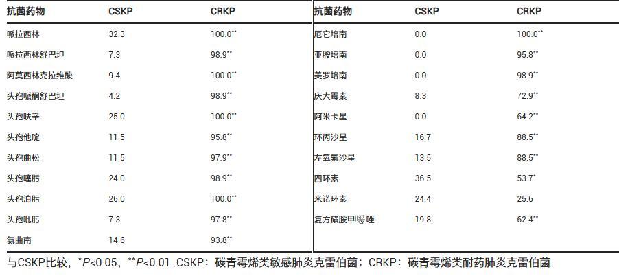 表1碳青霉烯类敏感和耐药肺炎克雷伯菌对抗菌药物的耐药率比较