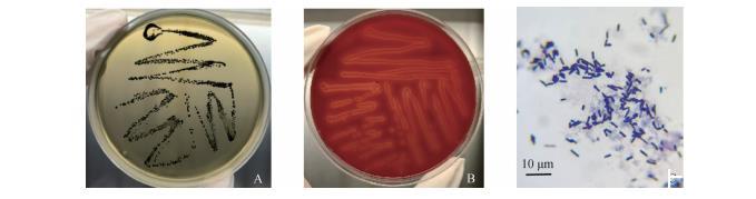 2.2.1 细菌分离鉴定分离菌株在RCM液体培养基中生长时出现浑浊并产生气泡;在胰胨-亚硫酸盐-环丝氨酸琼脂(TSC)培养基上形成直径2~5mm的外围含有一圈白色晕圈的圆形黑色菌落(图1A);在7%羊血琼脂培养基上可形成表面光滑、颜色灰白、透明状的圆形菌落(图1B);镜检为革兰阳性短杆菌(图1C)。