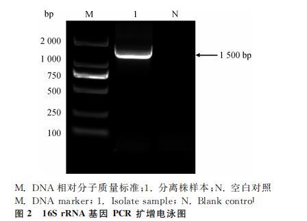 2.2.2 16S rRNA检测16S rRNA基因PCR扩增产物大小约为1500bp(图2),与预期长度一样。