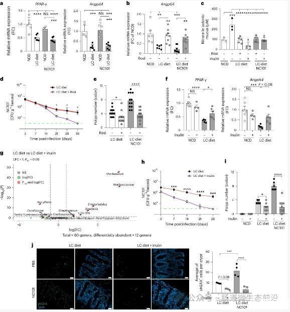 •给LC饮食小鼠补充PPAR-γ激动剂罗格列酮,可恢复Angptl4表达,降低硝酸盐水平和炎症因子,减少NC101定植和肿瘤。