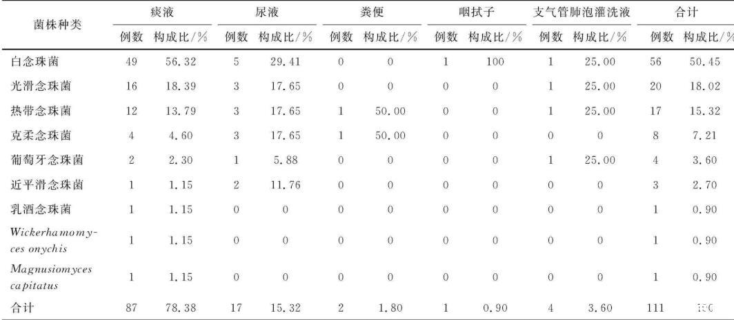 通过形态学鉴定与ITS测序,共鉴定出109株念珠菌,其中白念珠菌56株(50.45%),光滑念珠菌20株(18.02%),热带念珠菌17株(15.32%),克柔念珠菌8株(7.21%),近平滑念珠菌3株(2.75%)。菌株主要来源于痰液标本87株(78.38%),其次为尿液标本17株(15.32%)和支气管肺泡灌洗液标本4株(3.60%)。在109株念珠菌中,白念珠菌占比最高,但非白念珠菌(光滑念珠菌、热带念珠菌、克柔念珠菌)合计占比40.37%,表明非白念珠菌在新疆地区侵袭性念珠菌感染中占有重要地位。