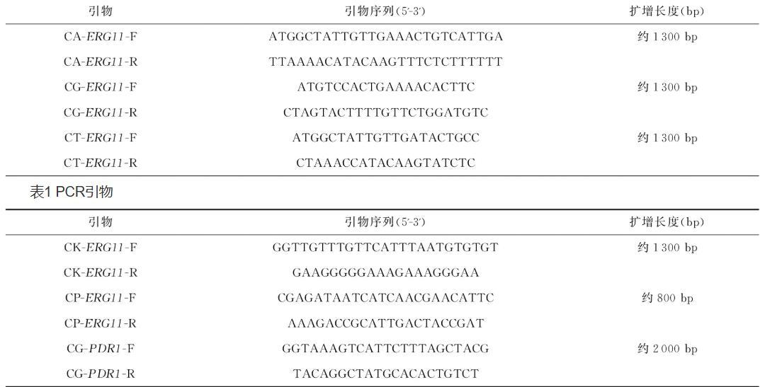 选取经oCelloScope微生物快速药敏监测系统检测确定为唑类耐药的33株念珠菌(白念珠菌6株、光滑念珠菌14株、热带念珠菌11株、克柔念珠菌1株、近平滑念珠菌1株),按照Ezup柱式真菌基因组DNA抽提试剂盒的说明书步骤,提取菌株的基因组DNA。参考GenBank数据库中念珠菌相关基因序列设计PCR引物,包括ERG11基因和PDR1基因。