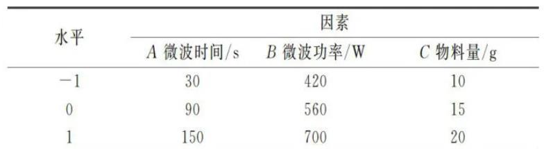 在单因素试验的基础上,应用Design-Expert 8.0.6.1软件,按照Box-Behnken设计原理,以微波时间、微波功率、物料量为自变量,以菌落总数为响应值进行三因素三水平的响应面优化试验,因素与水平见表1。