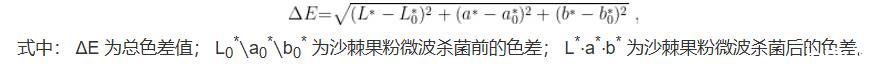 式中:ΔE为总色差值;L0、a0、b0为沙棘果粉微波杀菌前的色差;L、a、b为沙棘果粉微波杀菌后的色差。