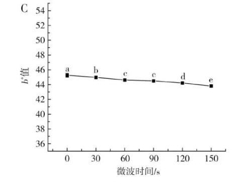 随着微波时间的延长,沙棘果粉的色差发生改变。由图2中A可知,随着微波时间的延长,沙棘果粉的L值呈上升趋势,说明在微波30~150 s范围内可以提升沙棘果粉的亮度。由图2中B可知,随着微波时间的延长,沙棘果粉的a值呈先平缓后上升的趋势,在0~90 s时,a值无显著性变化(P>0.05),这可能是因为微波时间相对较短,对沙棘果粉a值的影响较小;沙棘果粉的a值在90~150 s时显著增大(P<0.05),可能是因为随着微波时间的延长,沙棘果粉发生褐变。由图2中C可知,随着微波时间的延长,沙棘果粉的b值呈下降趋势,这可能是因为随着微波时间的延长,沙棘果粉发生褐变。当微波时间为0,30,60,90,120,150s时,ΔE分别为0,1.21,1.76,1.89,2.18,2.49。