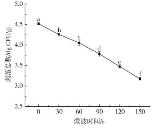 2.1.1 不同微波时间对沙棘果粉菌落总数和色差的影响微波时间对沙棘果粉菌落总数的影响见图1。