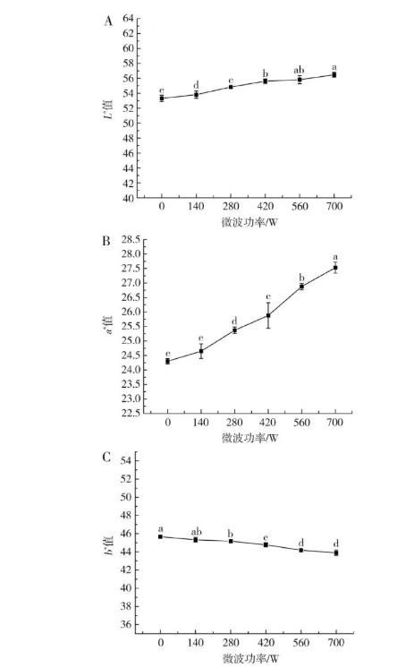 由图4可知,随着微波功率的增加,沙棘果粉的L值、a值均呈上升趋势,b值呈下降趋势,L值、a值、b值均有显著性变化(P<0.05),这可能是因为随着微波功率的增大,沙棘果粉发生褐变。微波功率为560W时的L值与420W和700W时无显著性差异(P>0.05),560W时的b值与420W时有显著性差异(P<0.05),与700W时无显著性差异(P>0.05),560W时的a*值与420W和700W时有显著性差异(P<0.05)。因此,选择微波功率560W作为响应面中心值。当微波功率为0,140,280,420,560,700W时,ΔE分别为0,0.69,1.92,2.93,3.89,4.85。