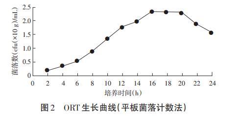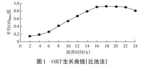 由图1可知,在2~16h曲线呈快速增长,ORT以几何级数生长,为对数生长期;16~20h曲线平缓,ORT总数处于稳定阶段,为稳定期;20h呈曲线呈缓慢下降趋势,ORT总数下降,为衰亡期。