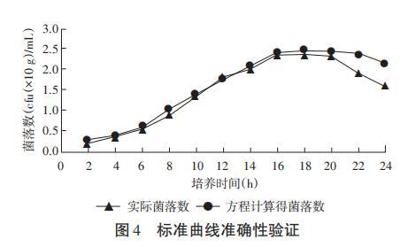 将1.2.1中所测的菌液培养不同时段的OD600nm值代入标准曲线,得出理论菌落数(cfu),并绘制出曲线与平板菌落计数法测定的生长曲线进行比较验证。