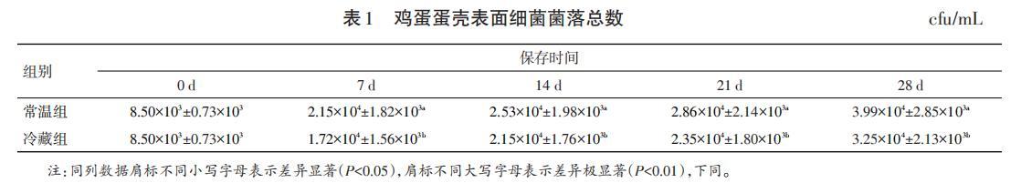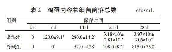 检测结果鸡蛋内容物菌落总数检测结果见表2。由表2可知,保存前鸡蛋内容物中没有检出细菌,随存放时间的延长,常温与冷藏条件下细菌总数均不断增加,但差异明显。常温条件下保存7d的鸡蛋内部已经有细菌滋生,14——21d菌落总数迅速增长,21d后菌落总数增幅仍较明显。冷藏条件下保存7d鸡蛋内容物未检出细菌,保存14d、21d、28d鸡蛋内容物细菌菌落总数均极显著低于常温保存组(P<0.01)。