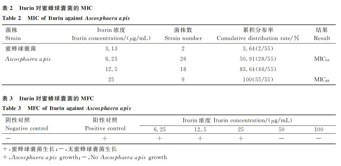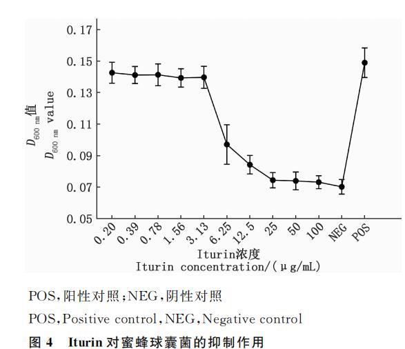 本研究从患白垩垩病蜜蜂幼虫中成功分离纯化蜜蜂球囊菌,脂肽Fengycin和Iturin可抑制蜜蜂球囊菌菌丝生长,Iturin作用效果最好,Surfactin无抑制作用。Iturin在48h对蜜蜂球囊菌的MIC₅₀、MIC₉₀和MFC分别为6.25、25和50μg/mL。Iturin可有效抑制菌丝生长、蜜蜂球囊菌孢子萌发,并破坏细胞膜和细胞壁。