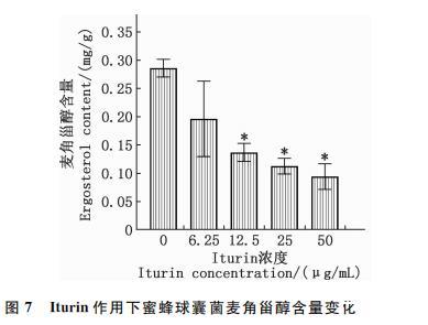 由图7可知,随着Iturin浓度的升高,麦角甾甾醇含量逐渐降低。与对照组相比,当Iturin浓度为12.5、25和50μg/mL时,麦角甾甾醇含量分别下降了52.18%、60.69%和67.12%,差异显著(P<0.05)。