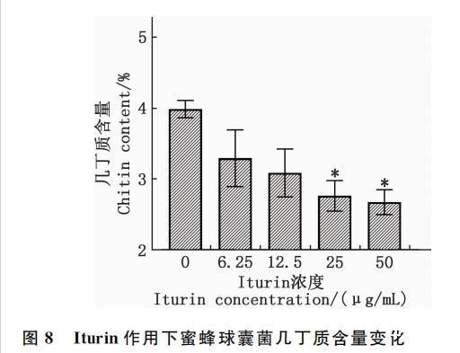 由图8可知,与对照组相比,Iturin各浓度处理组几丁质含量分别下降了17.39%、22.58%、30.69%和32.94%,25和50μg/mL Iturin组几丁质含量显著低于对照组(P<0.05)。