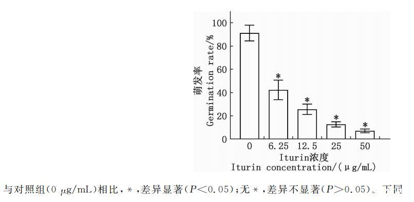 抑菌试验结果显示,Iturin抑菌效果呈现明显的浓度依赖性,3.13~25μg/mL范围内抑菌作用逐渐增强,25μg/mL时达到最大效果。孢子萌发抑制试验证实其抑制率与浓度呈正相关(6.25~50μg/mL)。相比对其他病原菌的MIC值(镰刀霉51.8μg/mL,灰葡萄孢霉37.0μg/mL),Iturin对蜜蜂球囊菌显示出更强的抑制活性,表明其具有高效、广谱的抗真菌特性。
