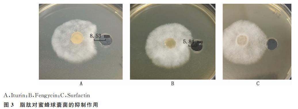 由图3可知,Iturin和Fengycin对蜜蜂球囊菌有抑制作用,Iturin的抑制作用最强,抑菌圈半径达8.53 mm,其次是Fengycin,抑菌圈半径为5.84mm,Surfactin对蜜蜂球囊菌无抑制作用。Iturin抑菌效果最好,选其进行后续试验。
