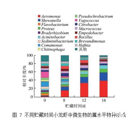 由图7可知,从整体上看,小龙虾样品中物种组成差异较大。总共涉及到17个菌属,包括气单胞菌属(Aeromonas sp.)、希瓦氏菌属(Shewanella sp.)、黄杆菌属(Flavobacterium sp.)、变形杆菌属(Proteus sp.)、不动杆菌属(Acinetobactor sp.)、丛毛单胞菌属(Comamonas sp.)、漫游球菌属(Vagococcus sp.)等,高通量测序法除传统培养法筛选到的10株细菌外还鉴定出黄杆菌属、丛毛单胞菌属和漫游球菌属等7个菌属,体现了高通量测序法的准确性及全面性。随着贮藏时间的延长,小龙虾鲜样期相对丰度较大的细菌,如丛毛单胞菌属、漫游球菌属逐渐减少,而气单胞菌属、希瓦氏菌属相对丰度则逐渐增加并成为优势菌群。在鲜样期(0 d),气单胞菌属、希瓦氏菌属相对丰度分别为1.40%、0.82%。而随着贮藏时间的延长,其相对丰度迅速增大,在贮藏末期(16 d),2种细菌的相对丰度分别达到38.7%、18.9%。结合传统培养法在小龙虾中筛菌结果可知,本实验中小龙虾样品的优势腐败菌为气单胞菌及希瓦氏菌。冷藏小黄鱼的优势腐败菌为变形杆菌及希瓦氏菌,而朱素芹等在凡纳滨对虾中筛选得到的优势腐败菌则为希瓦氏菌及不动杆菌,与本研究中产自武汉孝感的4℃贮藏小龙虾中筛选分离得到的优势腐败菌为希瓦氏菌及气单胞菌有所差异,可能是由于不同品种的水产品优势腐败菌有所差异。而本研究优势腐败菌种类与先前研究得出的小龙虾中优势腐败菌为希瓦氏菌、肉食杆菌、阴沟肠杆菌的结论也稍有不同,这说明即使是同一种水产品,其优势腐败菌也会因产地和贮藏温度的影响而发生变化。