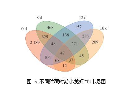 对测序得到的序列进行聚类分析,以98%以上的序列聚类成OTU,并根据不同贮藏时间小龙虾样本所对应的OTU绘制维恩图。由图6可知,贮藏0、8、12、16 d样品含有的OTU数分别为2 830、1 379、1 121和977。贮藏12 d(腐败中期)与16 d(腐败末期)样品中相同的OTU数为674,高出贮藏0 d(鲜样期)与16 d(腐败末期)样品约500,因此可以说明腐败中期与腐败末期的小龙虾样品微生物物种相似度更高。