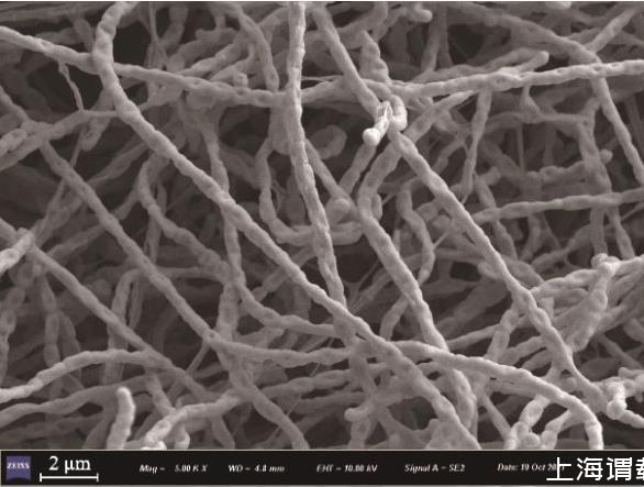 在ISP3培养基上,放线菌R2A-77单菌落形态呈圆形,气生菌丝生长繁茂,产生密集孢子堆,菌落呈现灰棕色。通过扫描电镜观察可知,菌株菌丝众多,孢子链伸展,形状为长圆形。