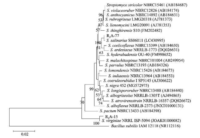基于16S rRNA基因序列建立系统发育树中,经过1000次聚类,菌株与S.salinarius SS06011进化关系最近。经形态学观察、生理生化特征检测,结合16S rRNA序列测序与系统进化分析,确定放线菌R2A-77为链霉菌(Streptomyces)。