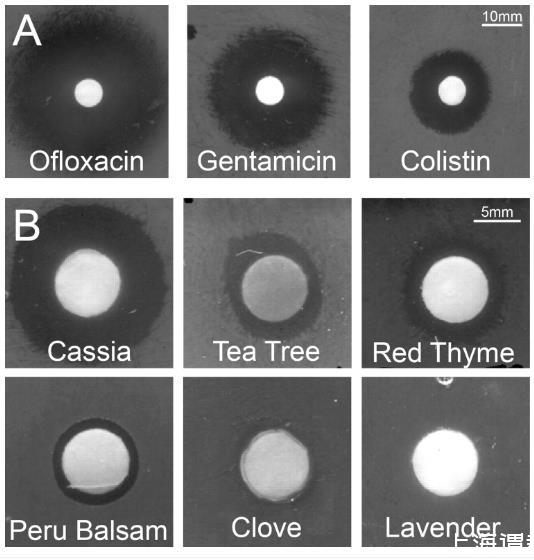 图2扩散试验鉴定出具有抗菌活性的精油。抗生素浓度为20 mg ml⁻¹(A)和纯精油(B)被测试对铜绿假单胞菌PAO1。产生抑制区的物质进一步分析;薰衣草油作为阴性对照。