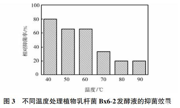 植物乳杆菌Bx6-2所产抑菌物质的温度稳定性实验结果如图3所示。由图3可知,植物乳杆菌Bx6-2所产的抑菌物质对热的稳定性较好,在60℃水浴中加热10min后,相对抑菌活性仍在65%以上。然而,当处理温度在60℃以上时,其抑菌效果明显下降。