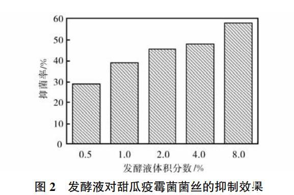 由图2可以看出,植物乳杆菌Bx6-2的发酵液对甜瓜疫霉菌菌丝生长有很强的抑制作用,菌丝抑菌率随发酵液浓度的降低而减少。当发酵液浓度为8%时,植物乳杆菌Bx6-2的抑菌率达到了58%,而当发酵液浓度降至0.5%时,其抑菌率仍可达到30%。