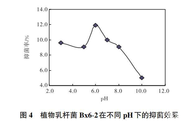 植物乳杆菌Bx6-2的发酵液在不同的pH下,其抑菌效果也各不相同(图4)。当pH6.0时,抑菌效果达到最好,在过酸和碱性环境中其抑菌效果明显降低。因此,在发酵液中活性物质分离纯化和使用过程中应保持在pH6.0的弱酸性环境。