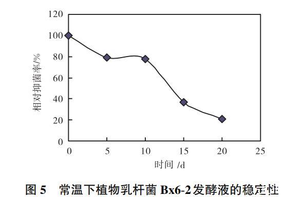 将植物乳杆菌Bx6-2的上清液经0.22μm膜过滤,分别在常温下放置5、10、15、20d,以甜瓜疫霉菌作指示菌,按1.5方法测定其抑菌率。