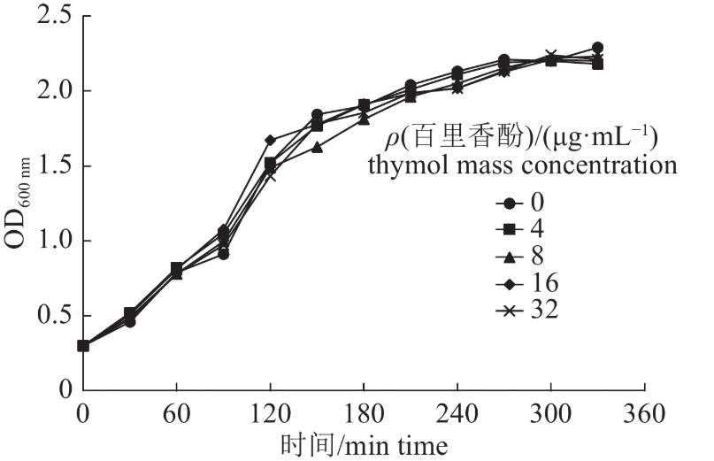 图1不同质量浓度的百里香酚对金葡菌USA300的生长曲线