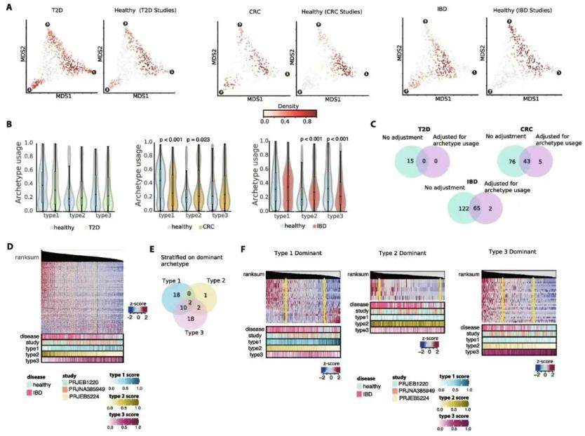 IBD与CRC样本向Archetype 2集中(图6),IBD伴随Archetype 3得分下降。