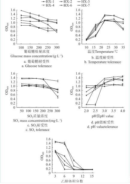 本土NS菌株对葡萄酒相关酿造因子的耐受性见图2。除HX-6菌株外,其余菌株的生物量均随葡萄糖质量浓度的增加而呈现下降趋势。葡萄糖质量浓度达到300 g/L时,HX-1、HX-3、HX-4菌株的OD600值明显低于其他菌株(图2a),表明其在高糖分条件下受到的抑制作用更强。由图2b可知,所有菌株在10℃的低温条件下均无法生长;15℃条件下,HX-2和HX-4菌株的生长情况明显弱于其他菌株,而在35℃时,HX-1、HX-3菌株生长活力明显下降。整体而言,同一种属菌株对发酵温度的耐受性具有一定相似性,不同种属菌株对发酵温度的耐受性存在明显差异。