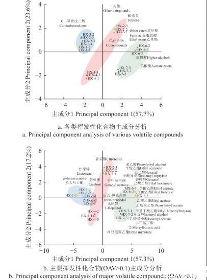 发酵酒样中各类挥发性化合物主成分分析结果见图8a。图中PC1和PC2方差贡献率分别为57.7%和23.6%,前两个主成分可以解释总方差的81.3%。HX-1、HX-3菌株与C13-降异戊二烯的生成相关联;HX-6、HX-7菌株分布在PC1的正半轴,但在PC2被明显区分,其中HX-6与乙基酯、脂肪酸与其他酯的生成强相关,HX-7与高级醇与乙酸酯的生成强相关。HX-2、HX-4在PC1、PC2轴上均分离开来,表明M.pulcherrima菌株的产香特性存在显著种内差异。