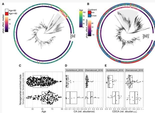 (D和E)与(B)中高龄个体富集进化枝以外的样本相比,KurilshikovA_2019和ZhernakovaA_2016的研究中该进化枝样本的(D)血浆胆酸和(E)鹅去氧胆酸相对丰度更高。