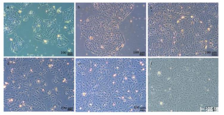 图1驴乳腺上皮细胞的形态学特征a:接种41 h后的岛屿状细胞集落;b:接种64 h后细胞集落扩大、融合;c:接种85 h后细胞逐渐铺满培养瓶;d:未纯化的F1代驴乳腺上皮细胞中混杂着成纤维细胞;e:纯化后的驴乳腺上皮细胞以多角形为主,偶见短梭形;f:冻存后复苏的驴乳腺上皮细胞。