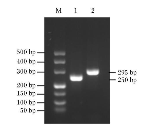 图3驴乳腺上皮细胞的琼脂糖凝胶电泳M:DL500 DNA Marker;1:磷酸甘油醛脱氢酶;2:细胞角蛋白18。