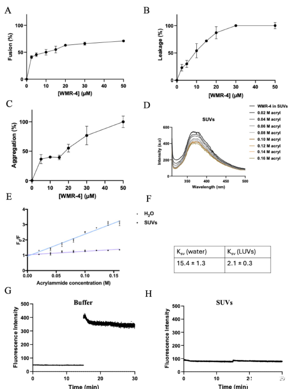 图2、WMR-4膜与LUVs的相互作用,模拟尖孢霉膜。A面板:脂质混合测定。B:泄漏测定。C:通过ThT分析法进行聚合。D–F:SUV在0.02 M至0.16 M(D)丙烯酰胺淬火后的荧光Trp光谱,数据采用Stern–Volmer方程(E和F)。G和H:WMR-4在缓冲液(G)和LUVs(H)中激发为355 nm的荧光发射,切割乳糜蛋白酶切割前后。