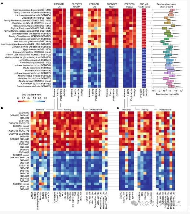 研究团队从检测到的肠道微生物物种中,筛选出661个常见的物种级基因组箱(SGB),并根据它们与37项健康标志物的关联程度,进行了系统性排名。