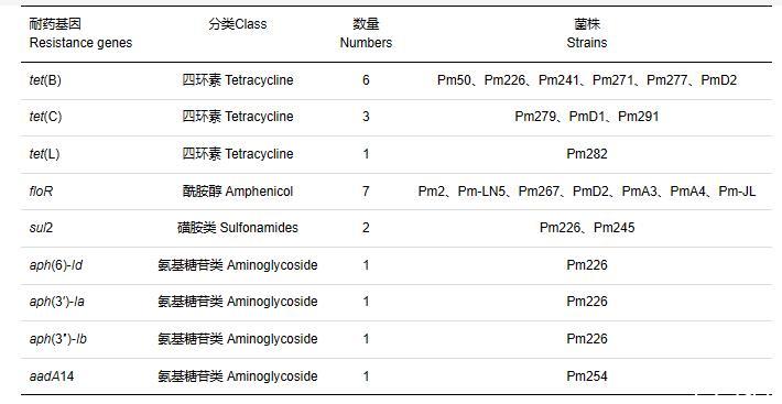 Pm二代测序组装的基因组与GenBank中的Pm全基因组大小一致,约为2.3 Mb。将组装后的基因组进行耐药基因检测,共检出9种耐药基因(表2),分别为四环素类药物的耐药基因tet(B),tet(C)和tet(L);氟苯尼考和氯霉素的耐药基因floR;链霉素和大观霉素的耐药基因aadA14;磺胺甲噁唑的耐药基因sul2;链霉素的耐药基因aph(6)-Id和aph(3″)-Ib;卡那霉素和新霉素的耐药基因aph(3′)-Ia;四环素类药物耐药基因检出率为29.41%(10/34),耐药基因谱型与耐药表型测定结果符合率较高Pm50、Pm226、Pm241等菌株均具有耐四环素类药物的耐药基因,MIC结果显示耐药;氟苯尼考和氯霉素耐药基因检出率为20.69%(7/34),但耐药表型与基因型存在不符的情况,Pm-LN5、Pm-JL和Pm267存在floR基因,MIC结果显示敏感。